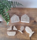 - Beautifully handcrafted wooden printing blocks made from recycled wood. As each block is individually handmade, your designs may vary slightly from those shown – making your set truly unique. The blocks include: two beach huts, two fish and two boats.