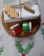 - 2 handcrafted wooden blocks – holly leaf and berry.