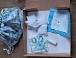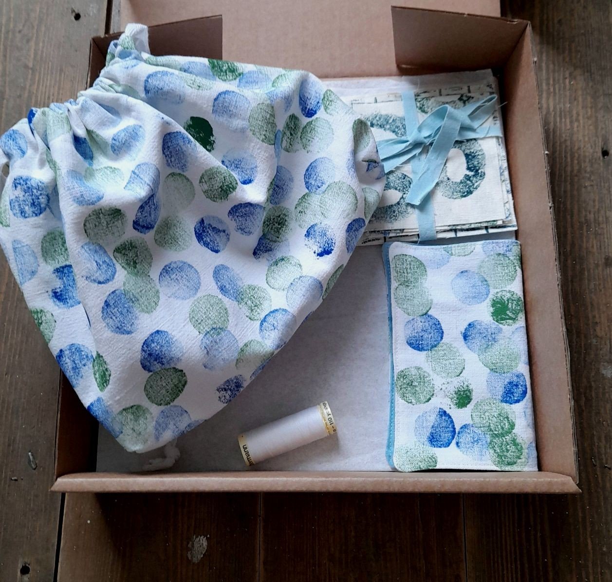 Each Box has 18 pieces of our individually designed and hand printed fabric in assorted colours and designs, nine plain lavender bags filled with homegrown lavender and rice, a needle case, handmade by me from our fabric, which has a needle and a few pins, a reel of white cotton and detailed instructions.