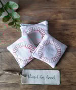 Made from 100% GOTS certified organic cotton, these bags are lovingly filled with a calming blend of homegrown lavender and rice. The set is elegantly tied together with a red ribbon, making it a thoughtful gift for yourself or a loved one.