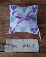 This beautiful handmade Patchwork Ring Cushion is individually designed and hand-printed, featuring four purple and four green heart designs with lilac ribbon. Made from vintage linen. The Ring Cushion is filled with rice and homegrown lavender.